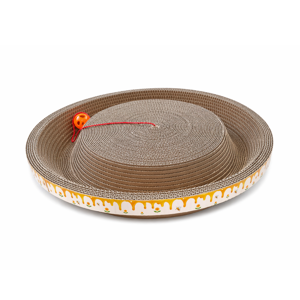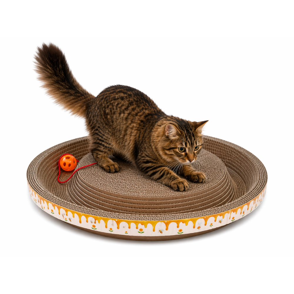 Esencial para que tu gato rasque, juegue y libere energía de forma natural. Su diseño circular de cartón corrugado ofrece una superficie ideal para el desgaste de uñas, mientras la pelota integrada estimula su instinto de juego y evita el aburrimiento.